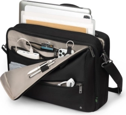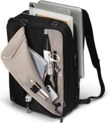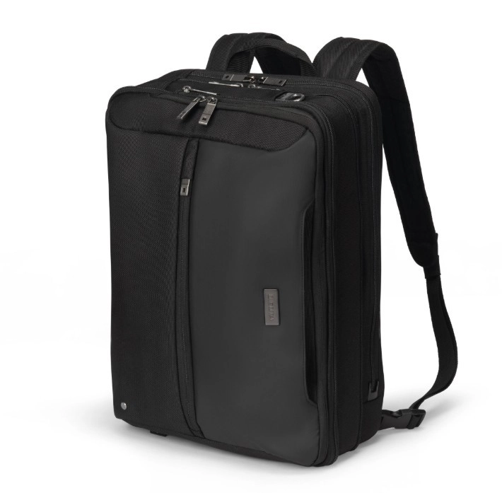 O geantă stilată pentru profesioniștii moderni, care poate fi transformată cu ușurință dintr-o servietă elegantă într-un rucsac confortabil. Compartimentul principal oferă spațiu pentru tabletă, documente și dispozitive mobile, în timp ce buzunarul frontal include buzunare structurate pentru accesorii și un buzunăraș special pentru cabluri și lucruri esențiale. În plus, fiind fabricată din 35,5 sticle PET reciclate, este o alegere inteligentă și ecologică.