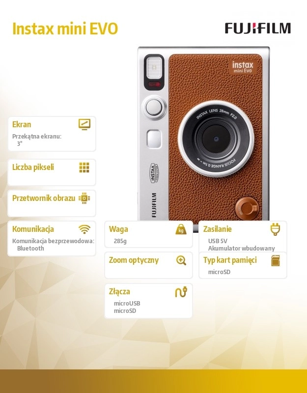 Instax mini Evo aduce o combinație unică de control digital și experiență analogică. Designul retro cu piele ecologică maro și elemente argintii se potrivește perfect în mână, iar comenzile practice îți permit să setezi rapid cadrul și să printezi imediat fotografia pe film INSTAX mini. Datorită obiectivului luminos f/2.0 vei obține imagini frumoase chiar și pe înserat.