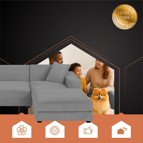 Husă canapea RUHHY din velur moale și elastic este alegerea ideală pentru protejarea și reîmprospătarea canapelei dumneavoastră cu șezlong. Se adaptează perfect formei mobilierului, nu alunecă și oferă interiorului un aspect confortabil și elegant.