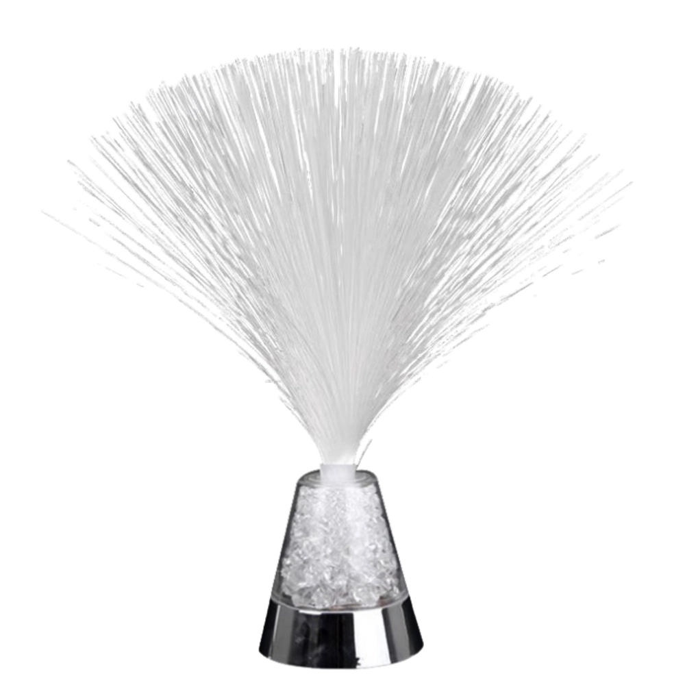 Lumină fină și uniformă crează o atmosferă plăcută de relaxare și liniște. Lampa este așezată pe o bază stabilă cu umplutură transparentă care imită cristalele de gheață, completată cu un finisaj cromat elegant. Fibrele optice flexibile se deschid ca un evantai, iar capetele lor sclipesc ușor în culori diferite.