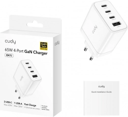 Încărcător revoluționar GaN de 65W cu trei porturi USB-C și un port USB-A, care permite încărcarea simultană a mai multor dispozitive mobile direct dintr-un singur încărcător.