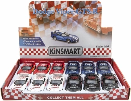 Model elegant al mașinii DODGE VIPER GTS‑R la scară 1:36, care îi va încânta atât pe copii, cât și pe colecționari. Construcție din metal și plastic, uși care se deschid și mecanism pull‑back pentru o cursă sprintenă. Disponibil în 4 variante de culoare.