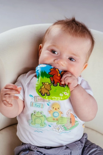 Pernița este realizată din materiale sigure fără ftalați și este certificată pentru copii din primele zile de viață. Este disponibilă cu mai multe modele drăguțe cu animăluțe, care susțin stimularea vizuală și primele cunoașteri.