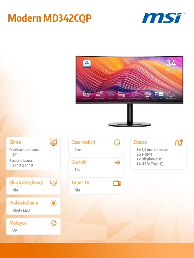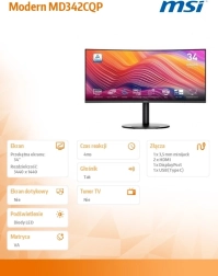 Modern MD342CQP aduce productivitatea și divertismentul la un nou nivel. Datorită rezoluției UWQHD pe diagonala de 34", ai mai mult spațiu pentru aplicații, timeline-uri și panouri laterale. Curbura ecranului te atrage în acțiune și îți îmbunătățește percepția periferică, fie că editezi fotografii, montezi video sau te cufunzi în jocuri.
