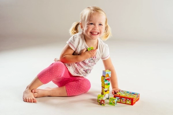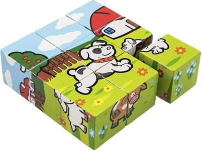 Cuburile conțin imagini viu colorate ale animalelor domestice, care atrag atenția fiecărui copil și stimulează imaginația în timpul jocului.