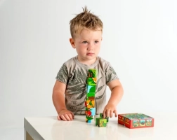 Această set de cuburi din lemn permite crearea a șase imagini diferite cu animale, oferind copiilor oportunități amuzante de explorare și învățare. Prin asamblarea și dezasamblarea cuburilor, copiii învață despre echilibru și cauză și efect.