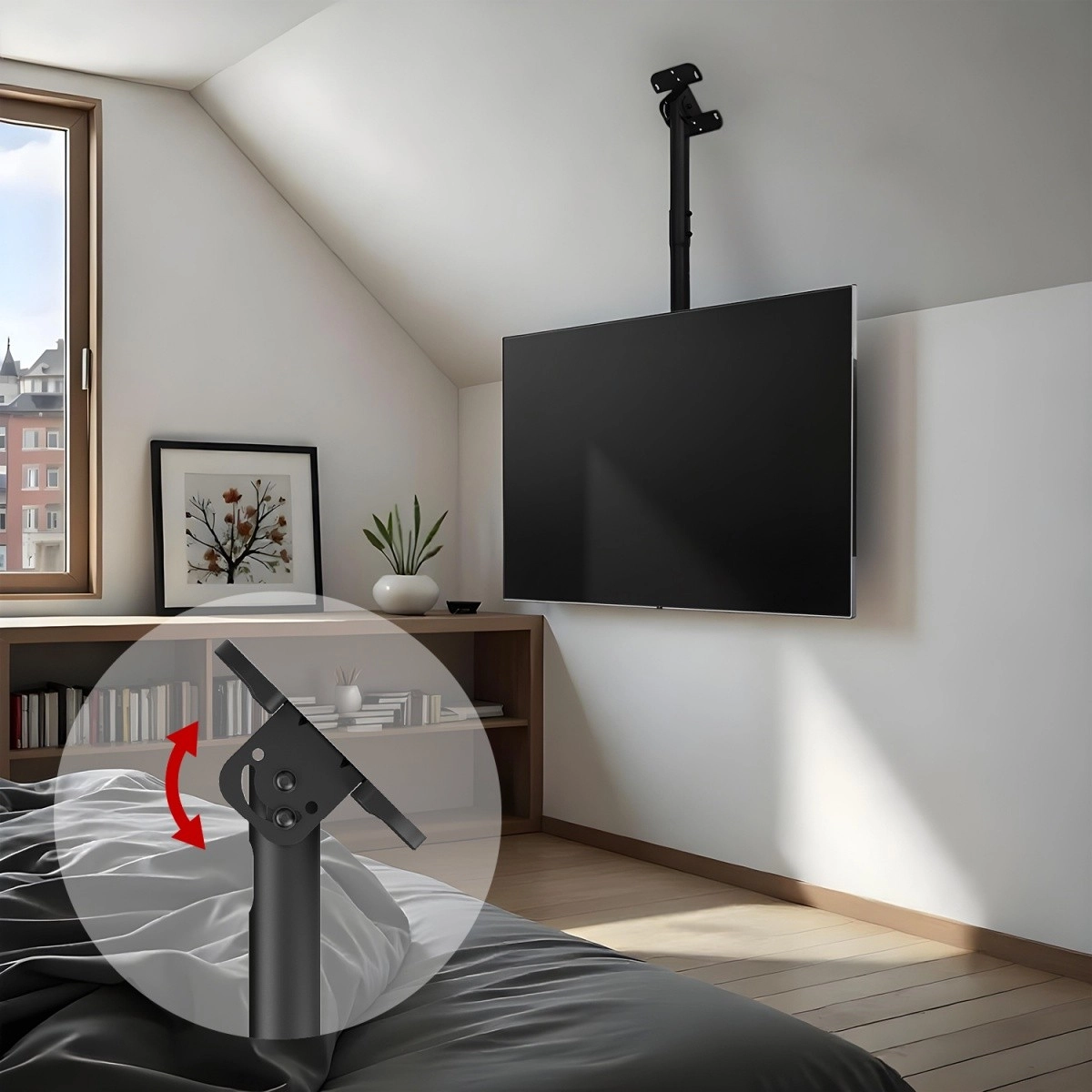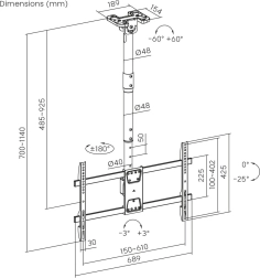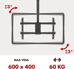 Libertate totală de ajustare permite personalizarea ecranului exact conform nevoilor dumneavoastră. Unghiul de înclinare poate fi ajustat până la 25° în jos, cu posibilitatea de rotație de 180° pentru o ajustare ușoară a televizorului în orice direcție. În plus, alinierea ecranului în intervalul de 3° este utilă în cazul micilor erori de montare. Suportul oferă, de asemenea, înclinare până la 60° la tavan și înălțime ajustabilă pentru o flexibilitate maximă a montajului.