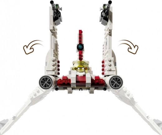 Modelul în combinație alb‑roșu oferă lansatoare funcționale, cockpit care se deschide pentru pilot și detalii grozave inspirate din Războaiele Clonelor.