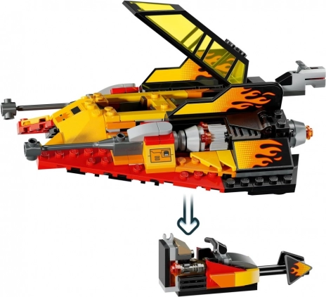 Cockpitul dublu rabatabil ascunde un speeder detașabil – prin apăsarea scaunului sau a capului minifigurinei, speederul este lansat instant în acțiune.