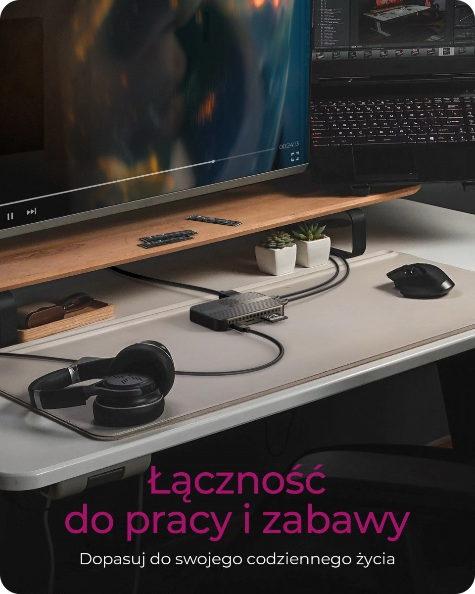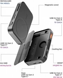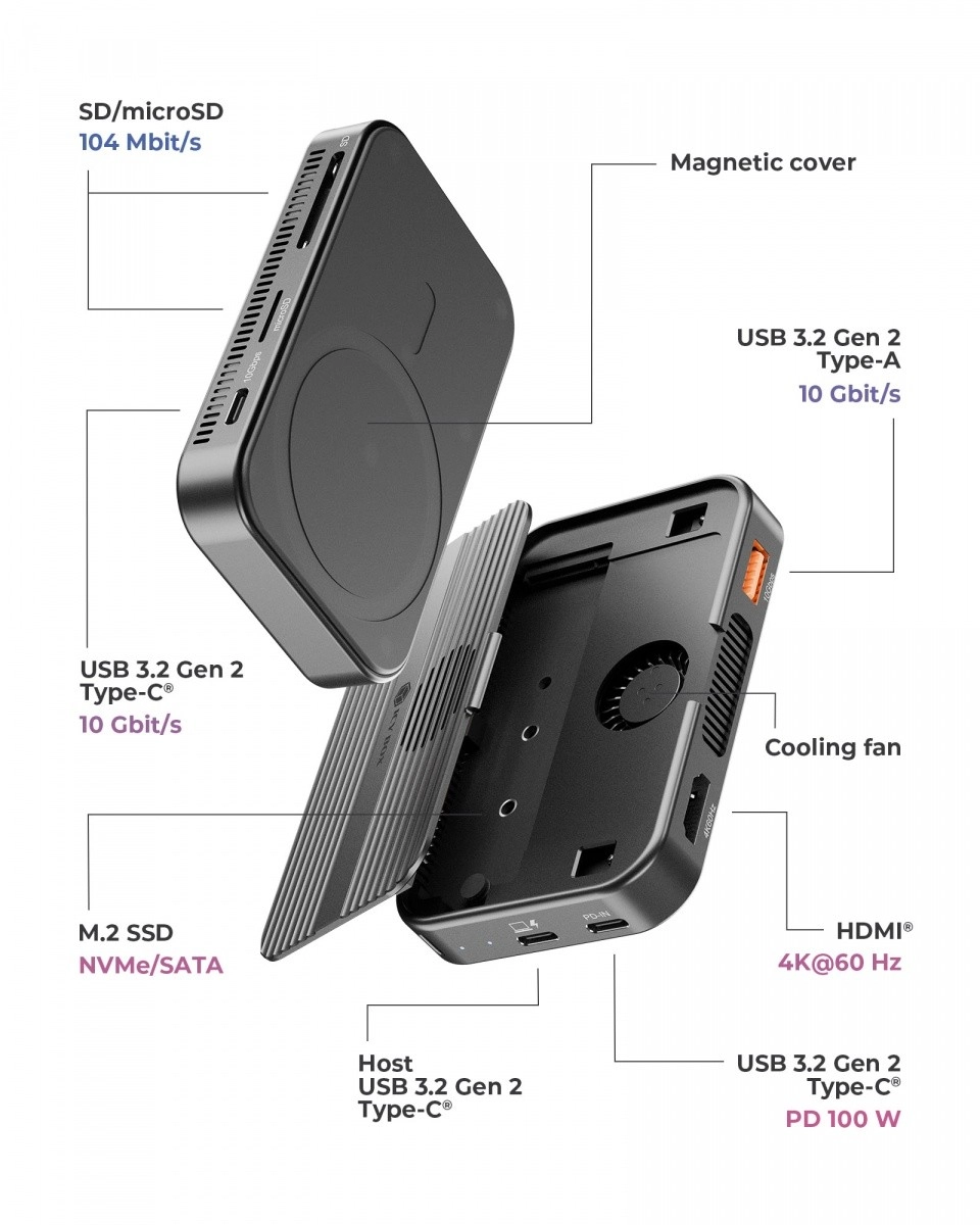 M.2 NVMe și SATA - Această stație de andocare combină o conexiune puternică cu o unitate de memorie externă rapidă, integrând un capac pentru M.2 NVMe și SATA SSD. Este soluția ideală pentru fișiere mari, backup-uri sau biblioteci multimedia, toate într-un dispozitiv compact de birou.