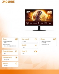 AOC 24G4HRE este un monitor de gaming de 23,8" care combină frecvența de reîmprospătare de 200 Hz, tehnologia Fast IPS și 1 ms GtG / 0,5 ms MPRT pentru o imagine perfect fluidă în scenele rapide. HDR10 oferă culori vii și contrast mai profund, în timp ce Adaptive Sync și compatibilitatea G‑SYNC elimină tearingul și sacadările.