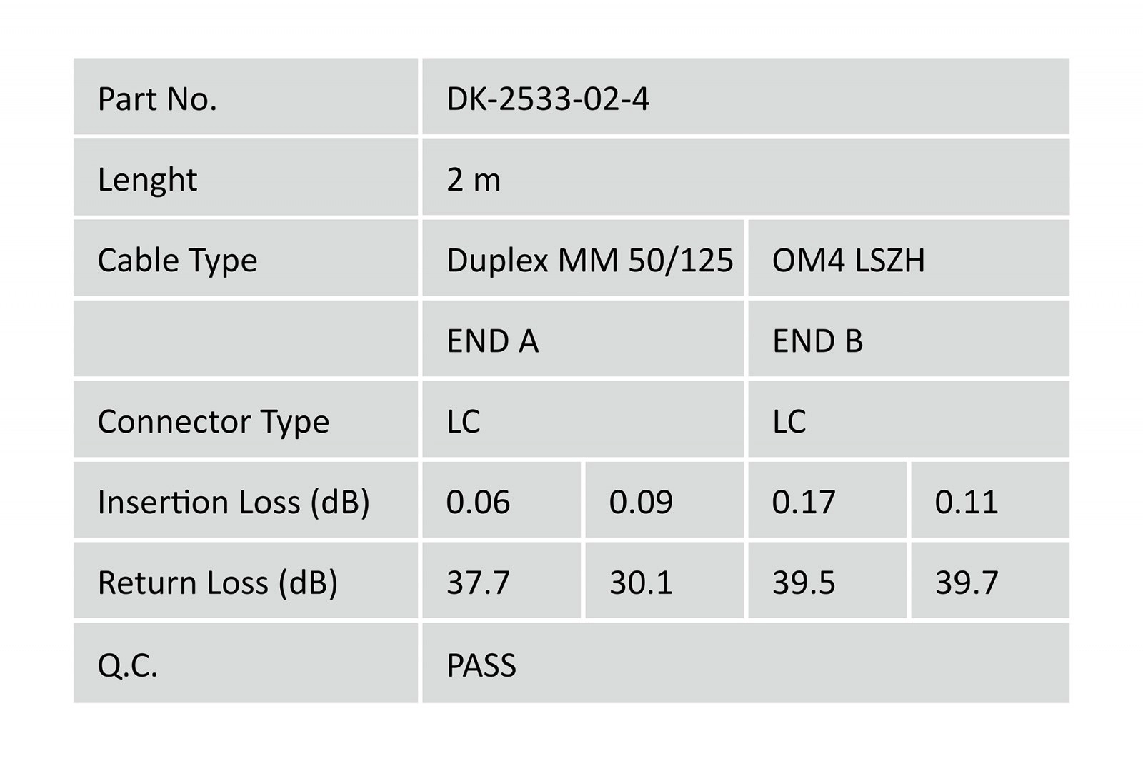 Conectorii LC cu ferule ceramice garantează o conexiune stabilă cu atenuare redusă. Manta LSOH minimizează fumigenitatea și nu conține halogeni, fiind potrivită pentru instalații interioare cu accent pe siguranță. Cablu livrat ambalat individual, cu protocol de măsurare pentru conformitate și calitate.