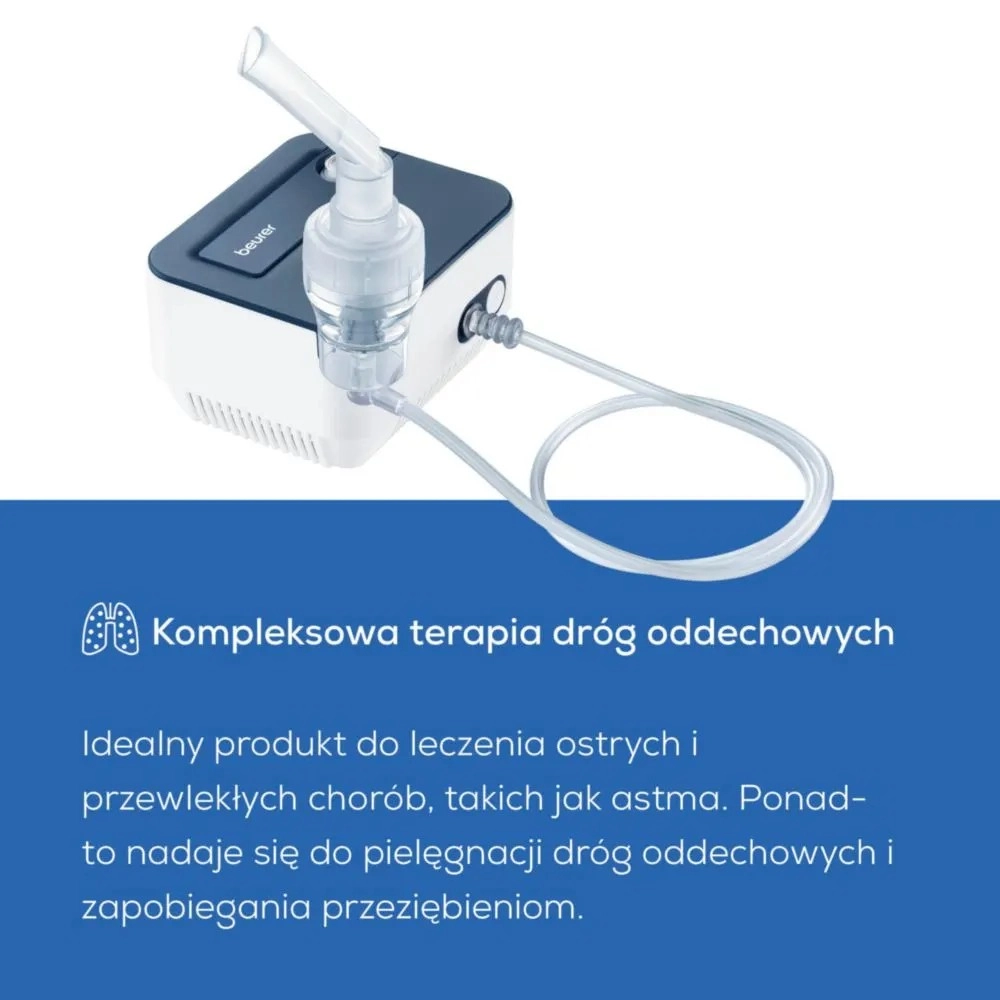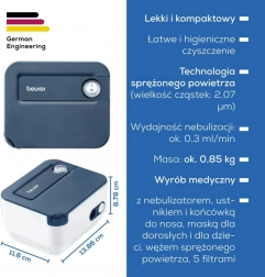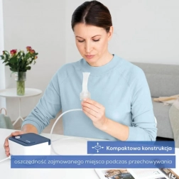 Dispozitivul este conceput pentru utilizare igienică și confortabilă – are componente detașabile pentru o curățare simplă și este compatibil cu toate medicamentele destinate și aprobate pentru inhalare (respectați întotdeauna recomandările medicului sau farmacistului). Tehnologia cu aer comprimat (cu compresor) asigură o pulverizare eficientă și timp mai scurt de inhalare datorită performanței ridicate de nebulizare.