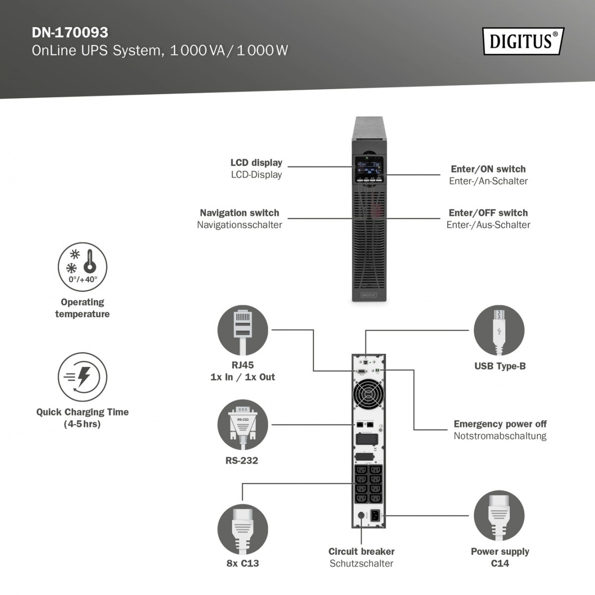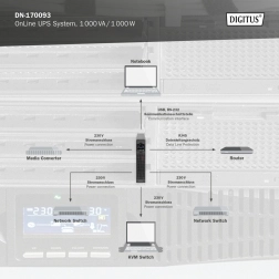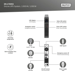 Sistemul UPS DIGITUS fiabil, cu tehnologie de conversie dublă on-line, protejează echipamentele sensibile împotriva întreruperilor și fluctuațiilor de tensiune. Oferă 1000 VA / 1000 W putere, interval de intrare larg, încărcare inteligentă și supradimensionare ridicată. Datorită LCD-ului rotativ setați ușor toți parametrii; include 8 prize C13 și interfețe USB/RS232 pentru monitorizare, precum și opțiune SNMP pentru administrare la distanță.