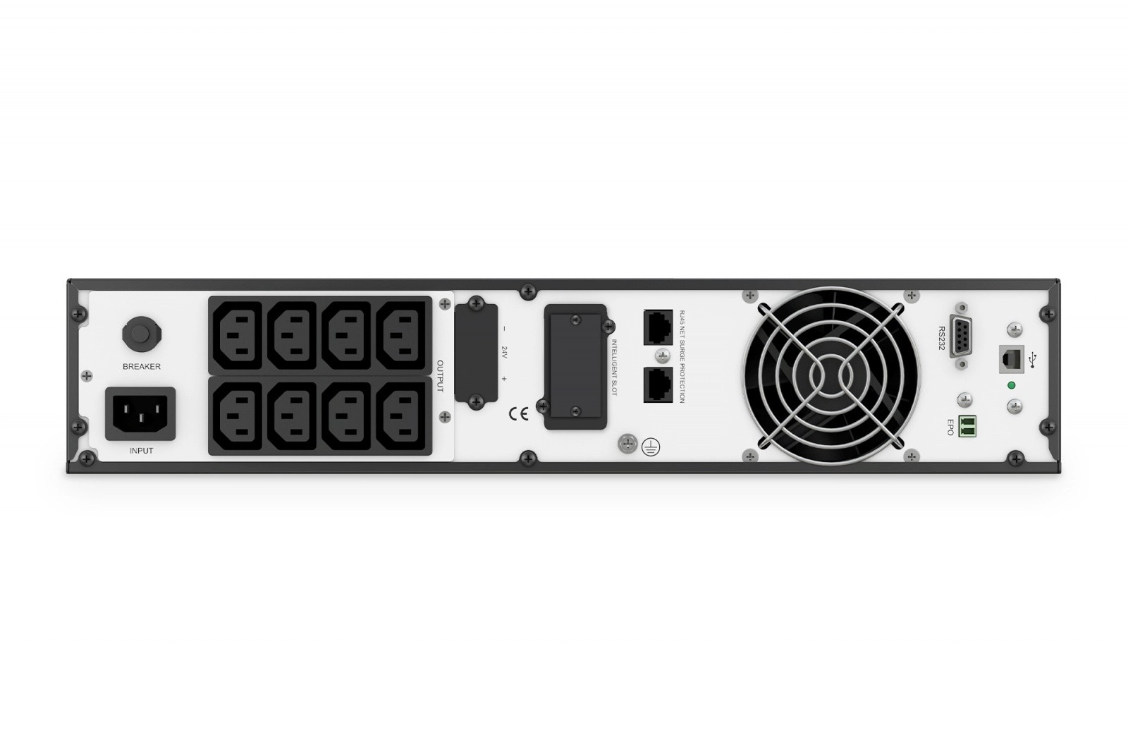 Afișajul LCD rotativ arată starea încărcării, a bateriei, modul AC, modul pe baterie, bypass și mesajele de eroare. Construcția Rack/Tower permite instalare flexibilă într-un rack de 19" sau independent. Gestionarea inteligentă a încărcării și a turației ventilatorului prelungește durata de viață a bateriilor și crește fiabilitatea.