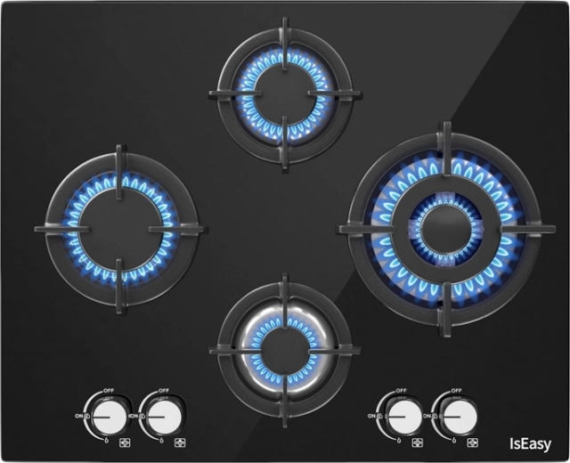Plita Iseasy se remarcă prin combinația de stil și performanță. Cele patru arzătoare, cu puteri de 3,3 kW, 2,7 kW, 1,75 kW și 1 kW, acoperă totul, de la fierbere lentă la prăjire rapidă. Sticla securizată durabilă și grătarele din fontă garantează o durată lungă de viață și întreținere ușoară, în timp ce aprinderea pulsată simplifică utilizarea zilnică.