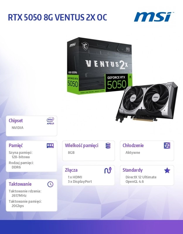 MSI GeForce RTX 5050 8GB VENTUS 2X OC este proiectată pentru performanță fluidă în jocuri și fiabilitate într-un format compact cu două ventilatoare. Datorită arhitecturii moderne NVIDIA Blackwell și tehnologiei DLSS 4 vei obține rate de cadre mai ridicate, o imagine mai clară și un timp de răspuns mai rapid în cele mai noi jocuri.