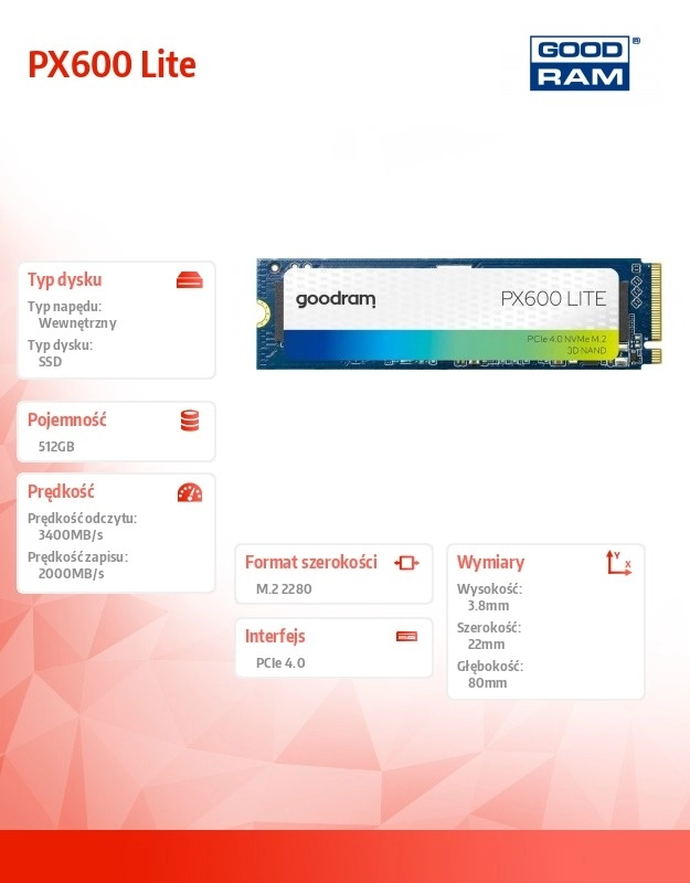 SSD-ul PX600 Lite rapid și eficient, cu o capacitate de 512 GB, oferă performanță PCIe 4.0 x4 pentru încărcarea rapidă a sistemului și a jocurilor. Formatul M.2 2280 se potrivește laptopurilor și desktopurilor moderne, oferind viteze de citire de până la 3400 MB/s și scriere de până la 2000 MB/s, fiind totodată rezistent la șocuri și vibrații.