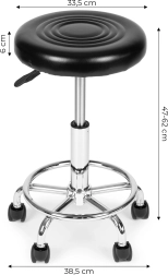 Cu ajutorul elevatorului pneumatic îți reglezi rapid înălțimea ideală și menții o poziție ergonomică fără solicitarea inutilă a spatelui și picioarelor. Șezutul cu spumă moale de 5 cm și tapițerie rezistentă din PVC se curăță ușor și rezistă la apă, uleiuri și dezinfectanți.
