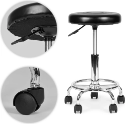 Scaunul rotativ profesional este conceput pentru medii în care confortul, mobilitatea și funcționalitatea sunt esențiale. Se potrivește perfect în salone cosmetice și de coafură, cabinete medicale, studiouri de masaj sau tatuaje. Construcția metalică robustă, cu bază stabilă în formă de stea cu cinci brațe și roți de calitate, asigură deplasarea ușoară pe diferite tipuri de pardoseli.