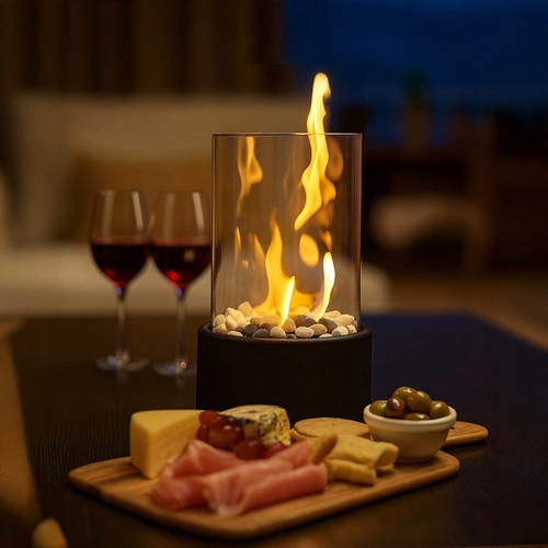 Biocamin elegant, independent, pe bioetanol, pentru apartament, casă și terasă. Oferă ardere curată fără fum și miros, flacără sigură protejată de sticlă și căldură plăcută cu atmosferă pentru seri de relaxare.