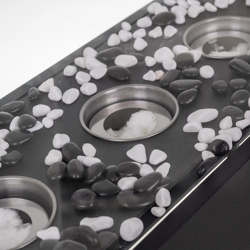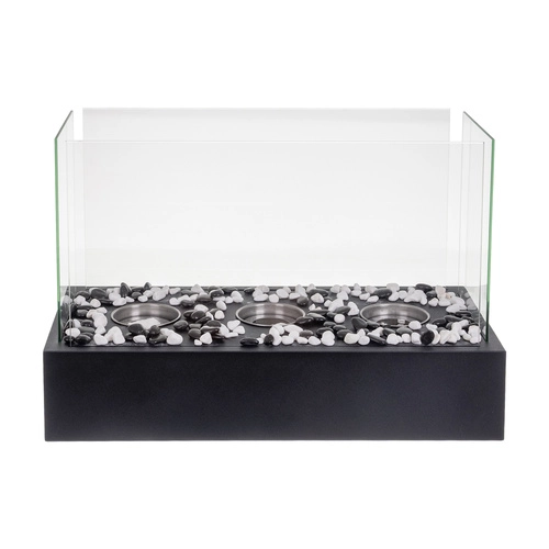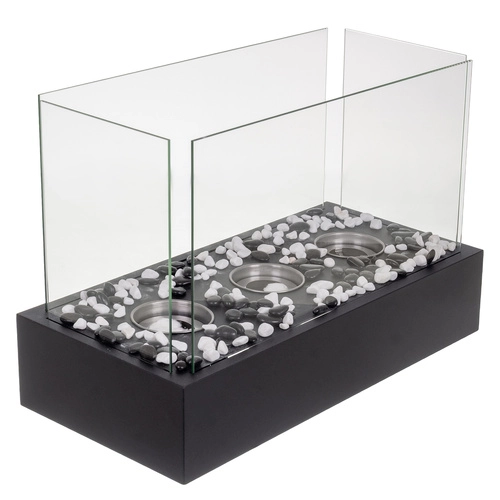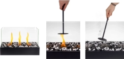 Sunt incluse 3 arzătoare din inox cu fibră ceramică absorbantă pentru ardere prelungită, pietricele decorative albe și negre și accesoriu de stingere. Montajul și operarea facile îl fac o alegere perfectă pentru a crea rapid atmosferă și căldură în serile răcoroase.