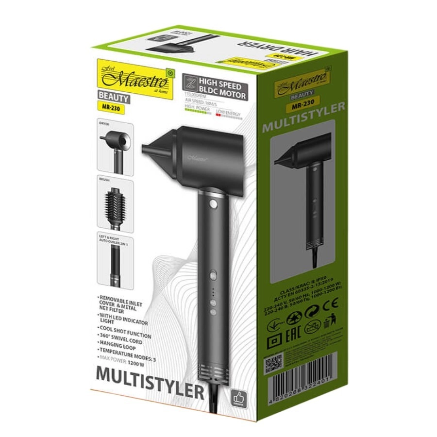 Cauți un singur instrument pentru uscare, volum și onduleuri? Multistylerul MAESTRO MR-230 oferă rezultate profesionale acasă datorită combinației a trei funcții cheie într-un corp compact. Motorul BLDC puternic, cu durată de viață mare, fluxul rapid de aer de 18 m/s și reglarea precisă a temperaturii protejează părul și scurtează timpul de coafare.