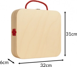 Toate componentele sunt finisate cu grijă și vopsite cu vopsele netoxice. Datorită valizei din placaj, cu închidere metalică și mâner din sfoară, totul este ordonat și gata de călătorie. Setul este un cadou ideal pentru fete și băieți și este în conformitate cu normele europene.