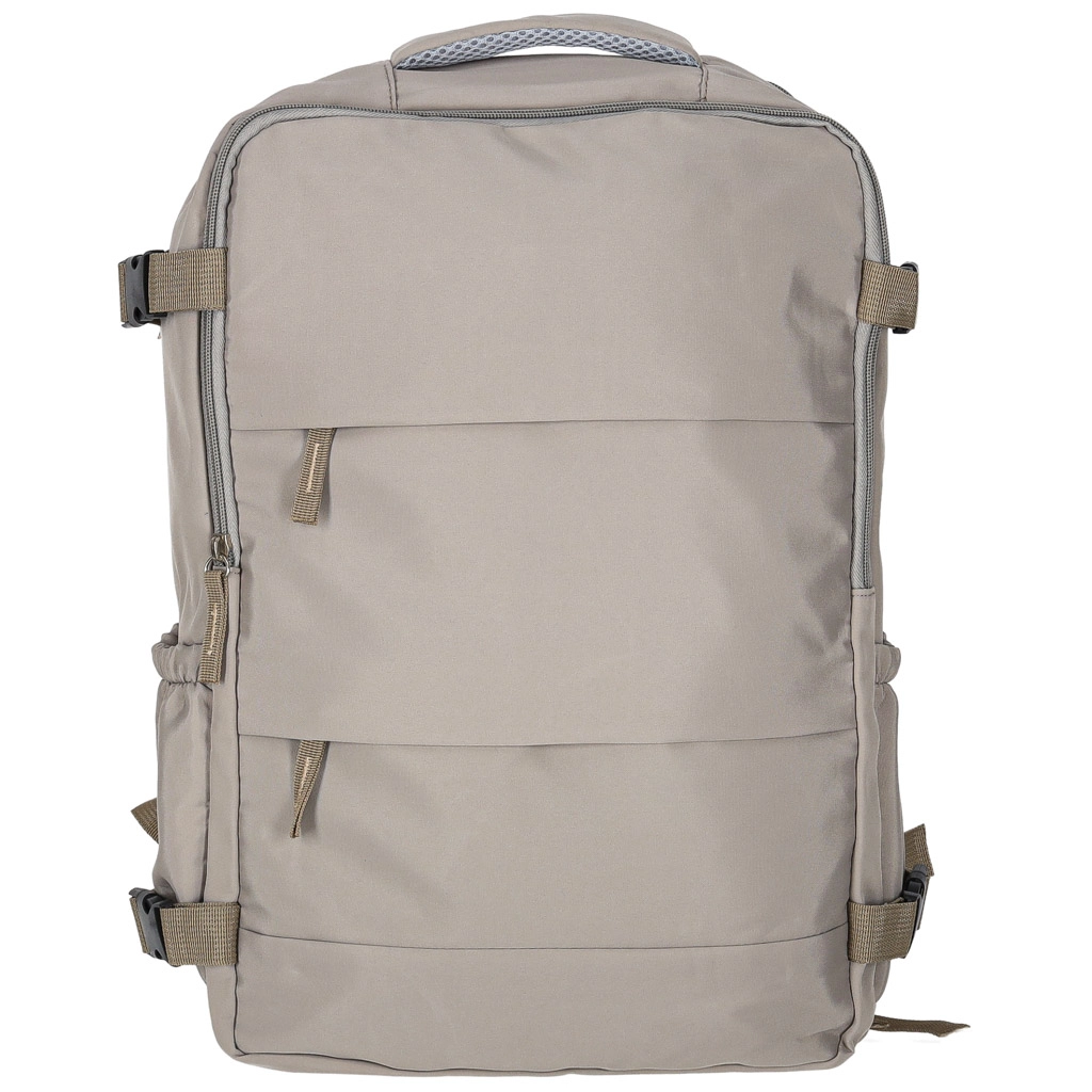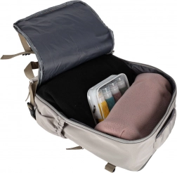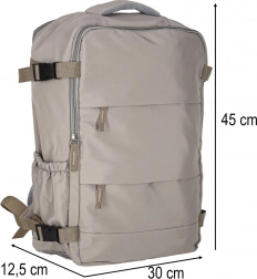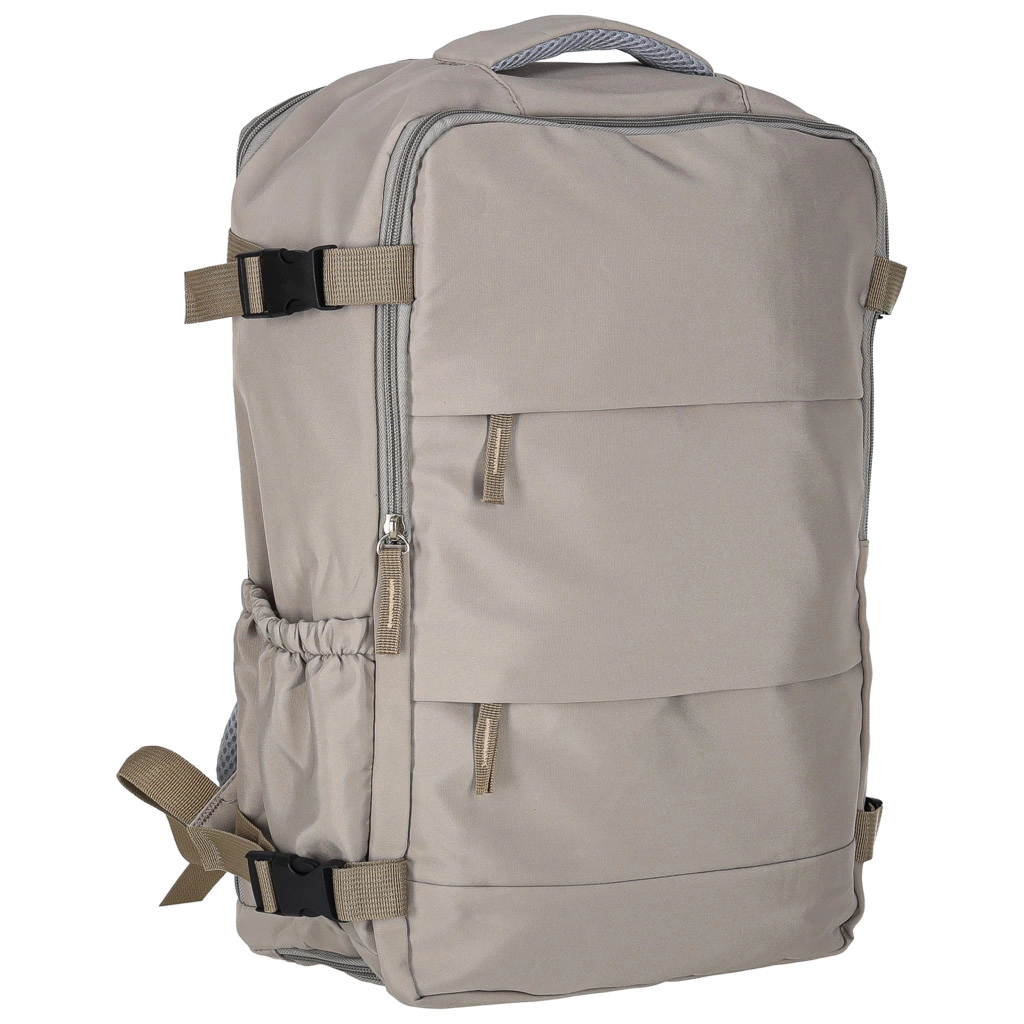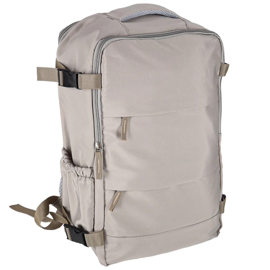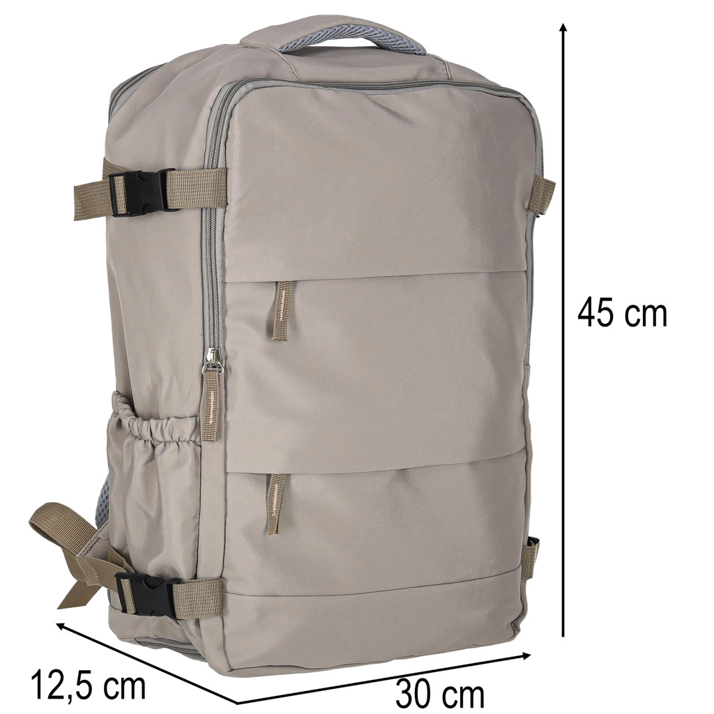 Patru curele de compresie reduc volumul și fixează conținutul, astfel încât rucsacul își păstrează forma chiar și când nu este plin. Două buzunare frontale cu fermoar și două buzunare laterale elastice sunt ideale pentru sticlă sau umbrelă. Dimensiunile compacte de 45 × 30 cm respectă cerințele multor companii aeriene pentru bagajul de mână.