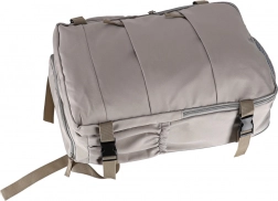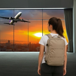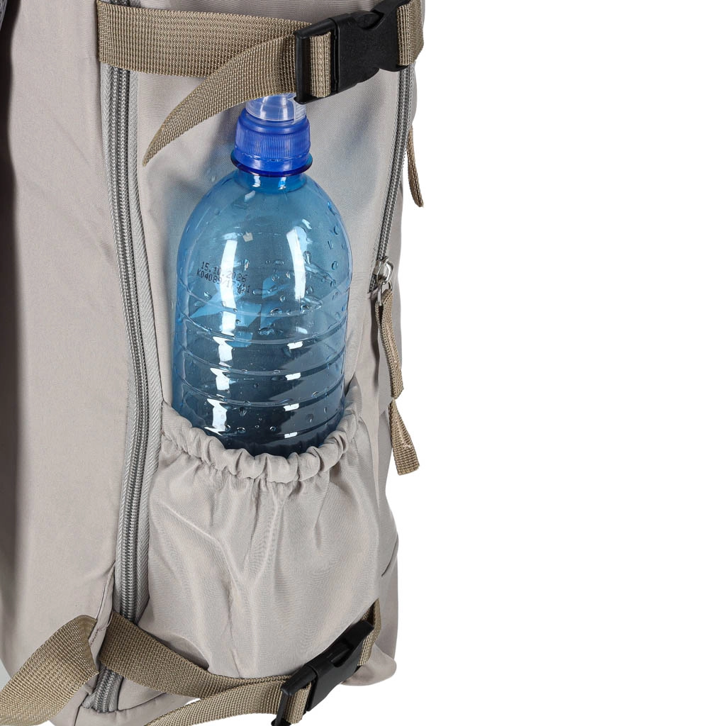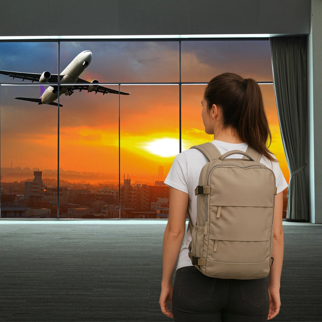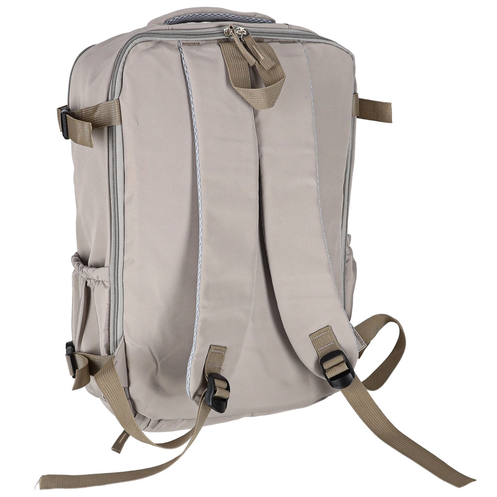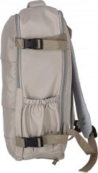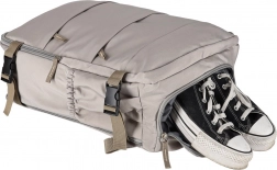 Patru curele de compresie reduc volumul și fixează conținutul, astfel încât rucsacul își păstrează forma chiar și când nu este plin. Două buzunare frontale cu fermoar și două buzunare laterale elastice sunt ideale pentru sticlă sau umbrelă. Dimensiunile compacte de 45 × 30 cm respectă cerințele multor companii aeriene pentru bagajul de mână.