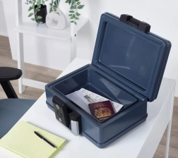 Cutia oferă până la 30 de minute de protecție certificată împotriva focului și 72 de ore de protecție etanșă la apă în caz de inundații sau scurgeri. Mânerul de transport integrat facilitează mutarea, iar formatul practic încape în dulap, sertar sau pe raft.