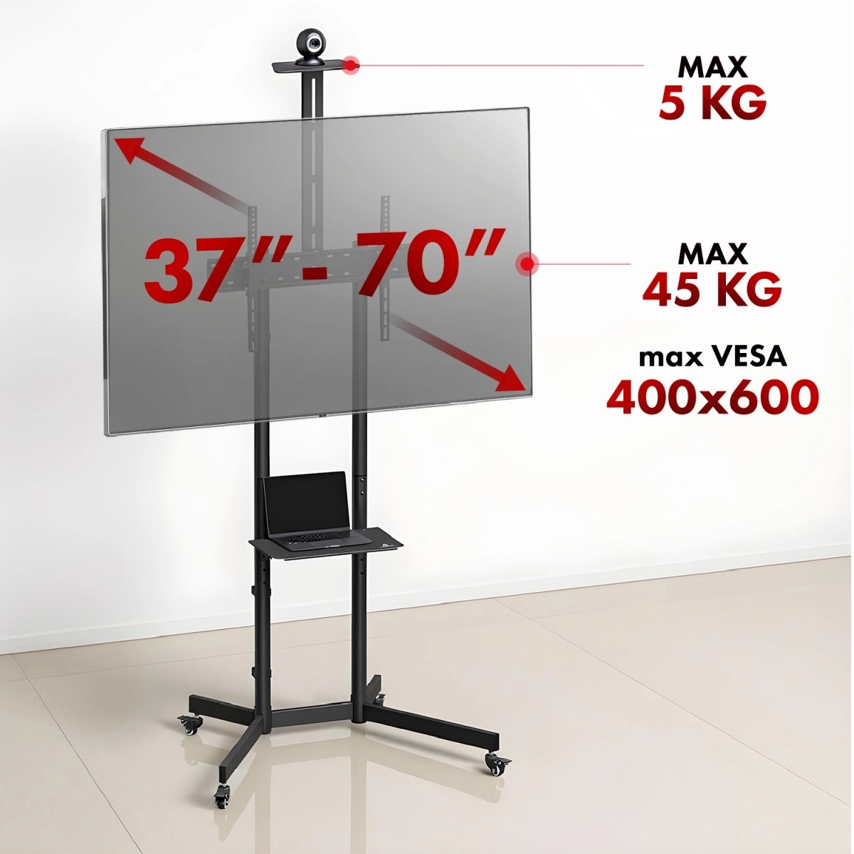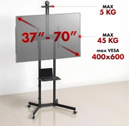 Suportul TV mobil este ideal pentru săli de ședințe, săli de curs și utilizare acasă. Construcția stabilă din oțel asigură prinderea în siguranță a majorității televizoarelor moderne cu greutatea de până la 45 kg. Datorită compatibilității VESA largi (100×100 până la 600×400), montați cu ușurință ecrane de la mărci precum Sony, LG, Samsung sau Philips.
