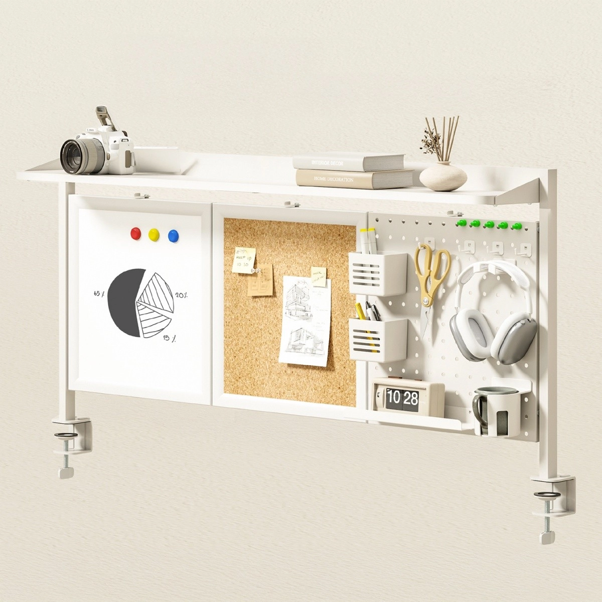 Tabla whiteboard este perfectă pentru notițe rapide, planuri și liste to-do, panoul din plută păstrează documentele importante la vedere, iar panoul perforat oferă posibilitatea de a agăța cârlige, coșulețe și polițe exact după nevoile dvs. Polița superioară îngustă pe toată lățimea este utilă pentru mărunțișuri, decorațiuni sau instrumente de scris. Datorită organizării inteligente, veți avea totul clar și la un loc, sporindu-vă productivitatea.