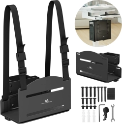 Eliberează spațiul de sub blat și protejează-ți hardware-ul de praf și șocuri. Acest suport negru pentru PC permite montaj pe perete sau pe un stâlp vertical, oferindu-ți acces mai bun la porturi și cabluri și menținând în același timp locul de muncă curat și ergonomic.