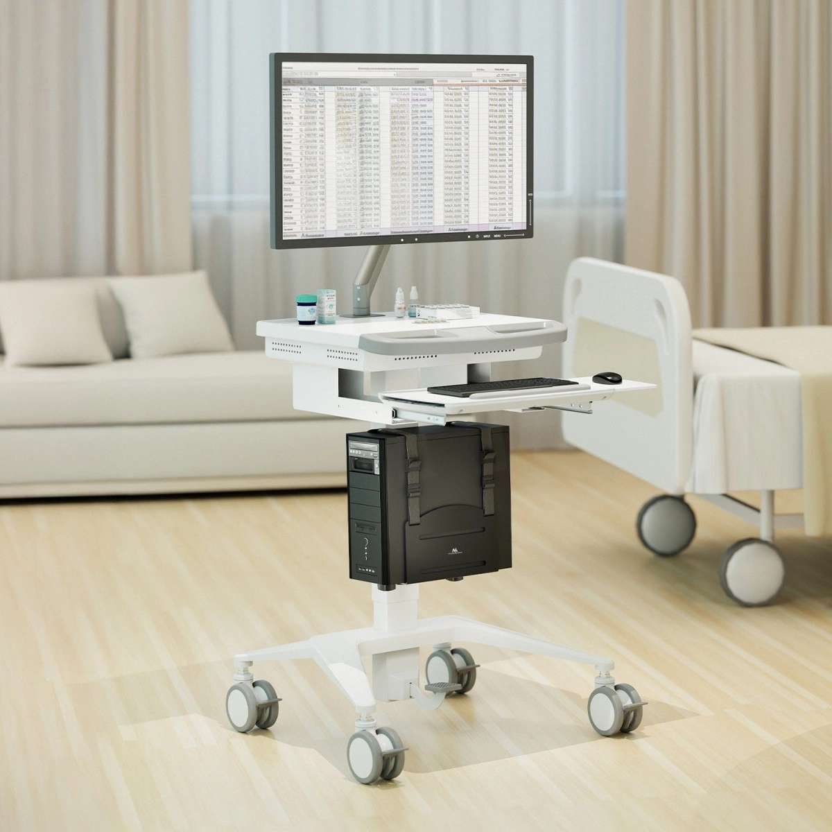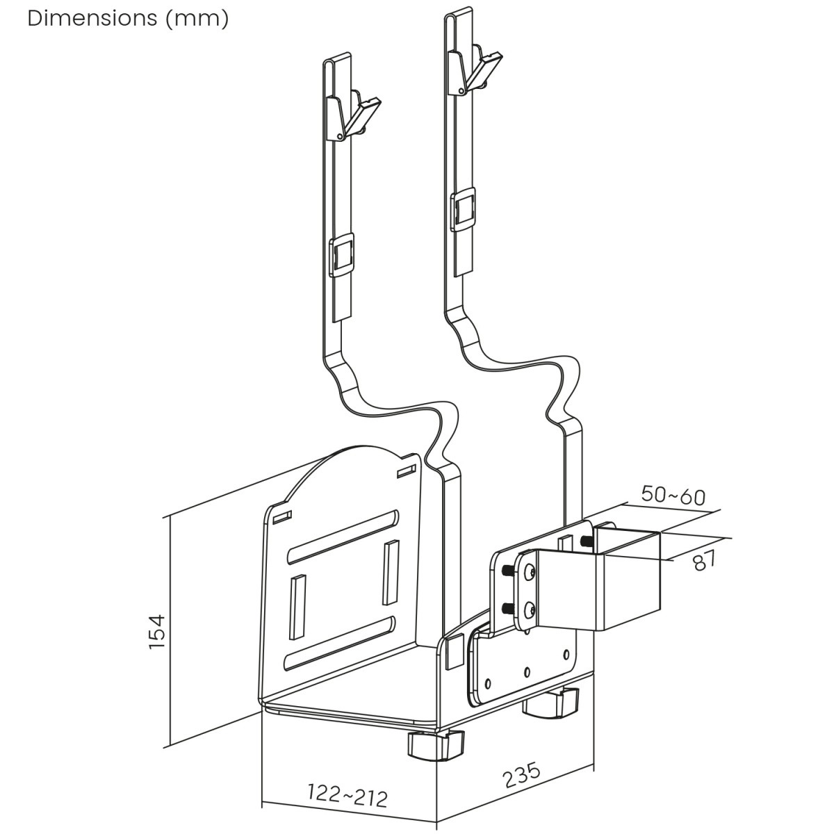 Montajul pe perete sau pe un stâlp vertical eliberează spațiul de sub birou și organizează cablurile pentru o ergonomie mai bună.