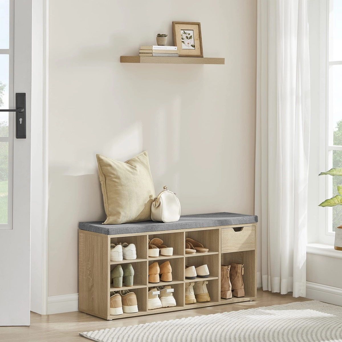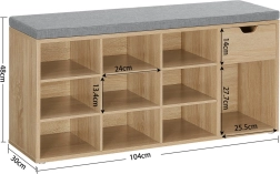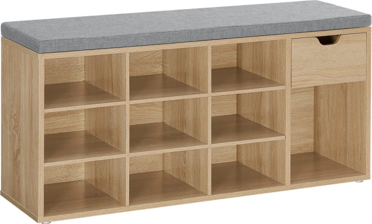 Pe blatul superior se află un șezut moale gri cu grosime de aprox. 4,5 cm, fixat de corpul dulapului cu scai (arici) – îl puteți îndepărta ușor pentru curățare. În interior veți găsi 10 rafturi adânci pentru încălțăminte până la mărimea aprox. 44 și un spațiu practic pentru mărunțișuri. Fiecare raft suportă până la 10 kg, iar capacitatea portantă totală a dulapului este de 200 kg.