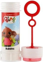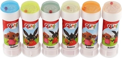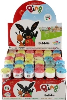 Bublifuc pentru copii, amuzant, cu eroii animați BING, aduce multă bucurie atât afară, cât și în casă. Conține 60 ml de soluție și are în capac un mic puzzle pentru și mai multă distracție. Potrivit pentru copii de la 3 ani. Culorile și motivele sunt livrate în mix, în funcție de stoc.