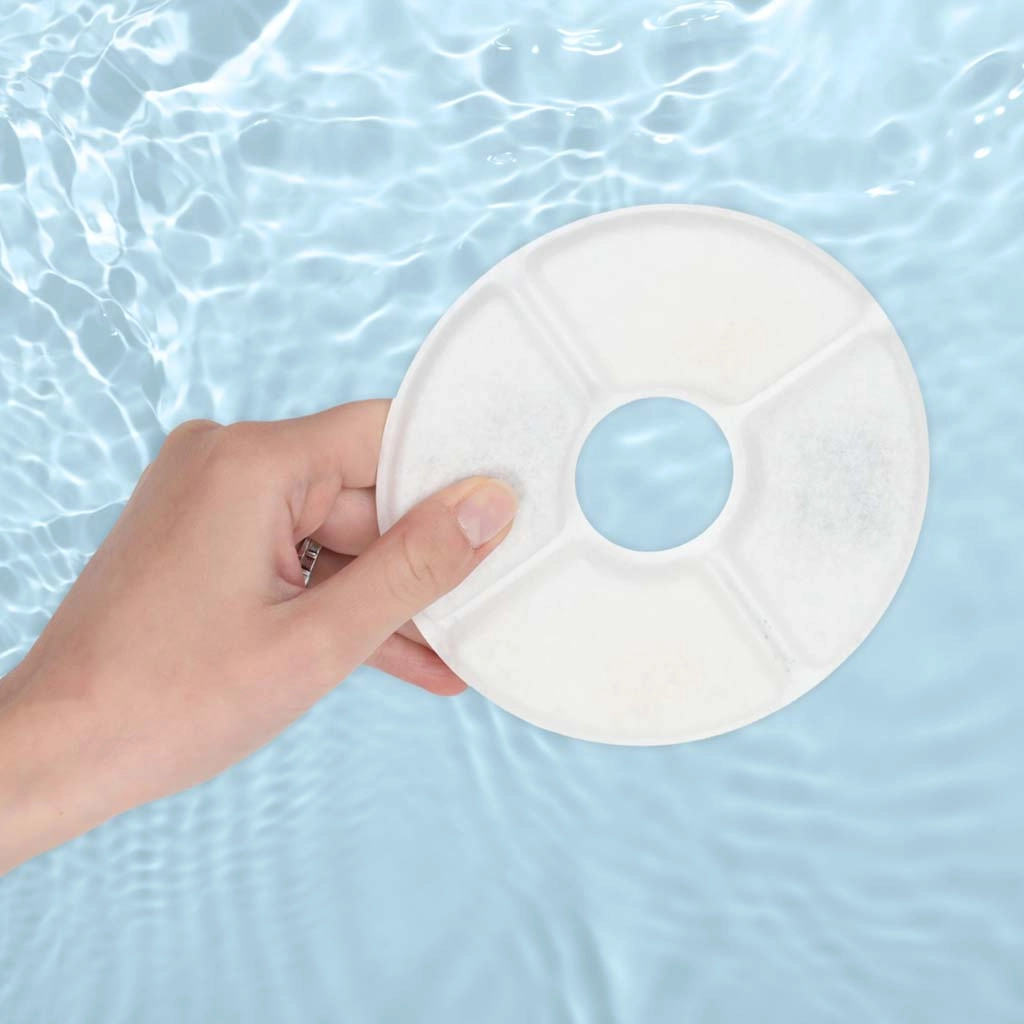 Filtrele au diametrul de 12,5 cm și un orificiu central de 3,5 cm, astfel încât se potrivesc ușor în majoritatea fântânilor rotunde cu stâlp central. Instalarea este rapidă și fără unelte – doar introduceți, clătiți și folosiți.