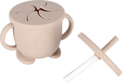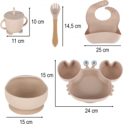 Acest set practic din silicon moale include tot ce aveți nevoie pentru hrănirea zilnică a celor mici: farfurie în formă de crab cu trei compartimente, bol cu ventuză, pahar cu două capace (inclusiv capac cu pai), patru tacâmuri și bavetă reglabilă cu buzunar. Ventuzele de pe farfurie și bol previn răsturnarea și alunecarea veselei, iar compartimentele ajută la separarea porțiilor.