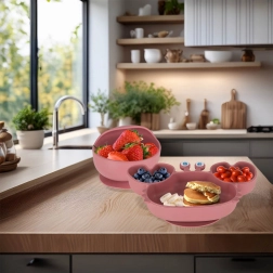 Farfuria în formă de crab cu trei compartimente păstrează porțiile separate și, datorită ventuzei, rămâne fixă pe loc. Ideală pentru primele diversificări și pentru platouri variate.
