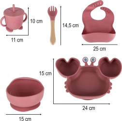 Acest set din 9 piese, într-o nuanță elegantă de roz închis, conține tot ce aveți nevoie pentru hrănirea comodă și sigură a copilului de la 6 luni. Farfuria crab compartimentată și bolul cu ventuze eficiente stau fixe pe masă sau pe scaunul de masă, reducând căderile și murdăria. Silicon alimentar moale, fără BPA, blând cu gingiile și dinții, ușor de curățat.