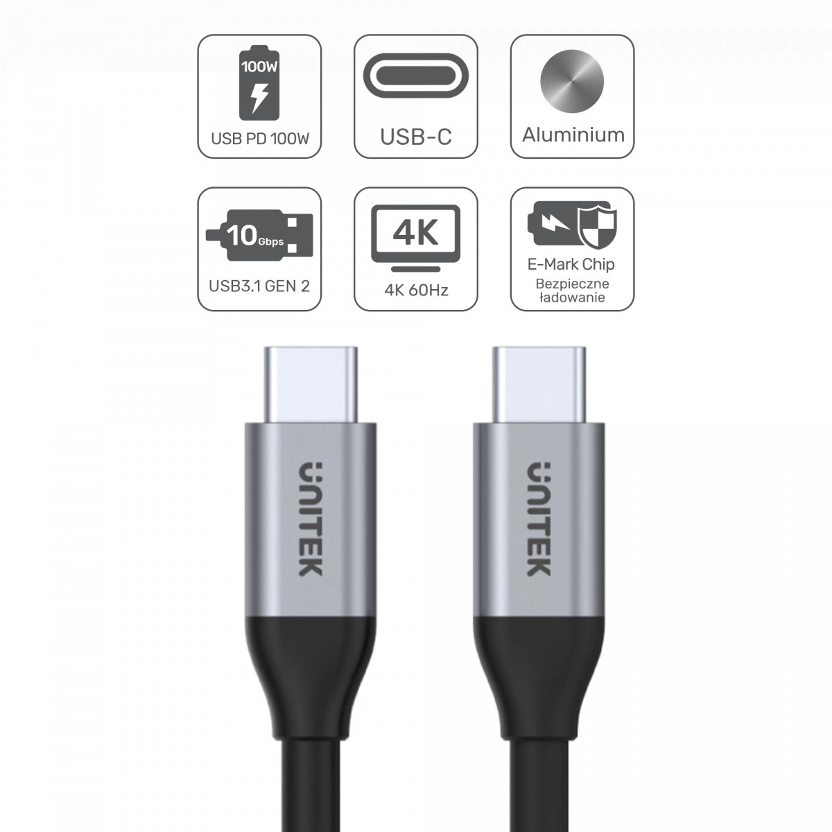 Cablu USB‑C ↔ USB‑C de 1 m, fiabil, pentru transfer rapid de date de până la 10 Gbps, video 4K la 60 Hz și Power Delivery 100 W. Datorită cipului E‑MARK, încărcarea și sincronizarea sunt rapide, stabile și sigure; capetele din aluminiu asigură durabilitate în utilizarea de zi cu zi.