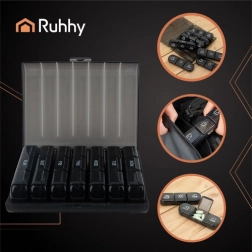 Mențineți medicamentele și suplimentele perfect organizate. Organizatorul RUHHY oferă șapte cutii zilnice separate, fiecare cu trei compartimente pentru dimineață, prânz și seară. Marcajele clare și închiderea tip click minimizează erorile și asigură că dozele sunt mereu la îndemână.