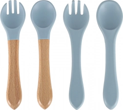 Bavețica ajustabilă din silicon cu buzunar adânc reține majoritatea resturilor și protejează hainele. Două seturi de tacâmuri (din silicon și cu mâner din lemn) sprijină diferitele etape de învățare a prinderii și preluării alimentelor. Cana cu capac și pai ajută la exersarea băutului independent fără vărsări inutile.