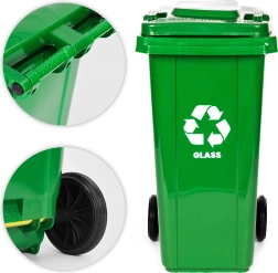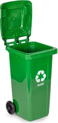 Container practic și rezistent pentru colectarea selectivă a sticlei, cu volum de 120 l, din HDPE rezistent la UV, substanțe chimice și deteriorări mecanice. Roțile din cauciuc și mânerul ergonomic asigură manevrare ușoară, iar capacul etanș protejează împotriva ploii și a mirosurilor. Stabilitatea pe suprafețe alunecoase este îmbunătățită de picioarele antiderapante. Potrivit pentru gospodării și firme, compatibil cu colectarea municipală conform EN 840 și certificat ISO9001, ISO14001, ISO45001.