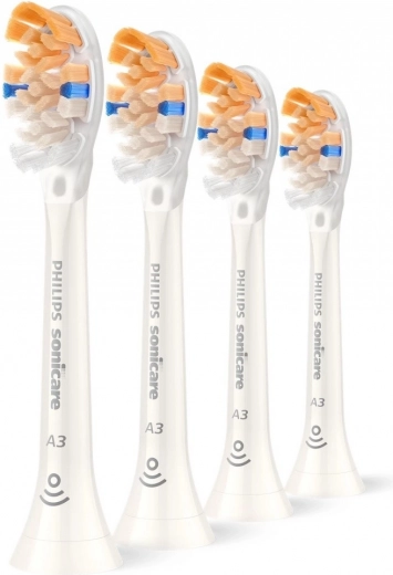 Capetele de schimb PHILIPS Sonicare A3 All‑in‑One sunt proiectate pentru eficiență maximă și confort. Mănunchiurile de peri special conturate, cu profil triunghiular, sporesc contactul cu suprafața dintelui pentru îndepărtarea rapidă a petelor, în timp ce perii laterali mai lungi îngrijesc linia gingivală. Tehnologia sonică transmite efectul de curățare și în spațiile interdentare și de-a lungul marginii gingiilor.