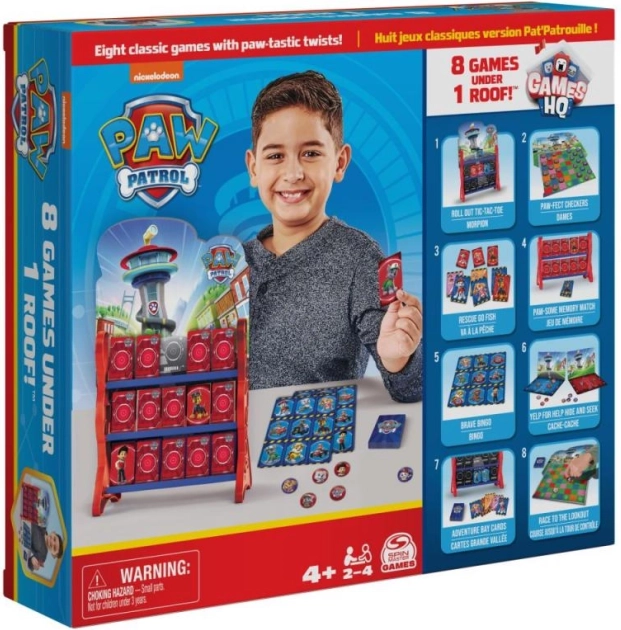 Bucură-te de distracție în familie cu un set de opt jocuri clasice în stilul 3D al centralei PATRULA CĂȚELUȘILOR. Găsești aici bingo, x și 0, dame și alte jocuri simple pentru 2–4 jucători de la 4 ani, care dezvoltă logica, concentrarea și munca în echipă.
