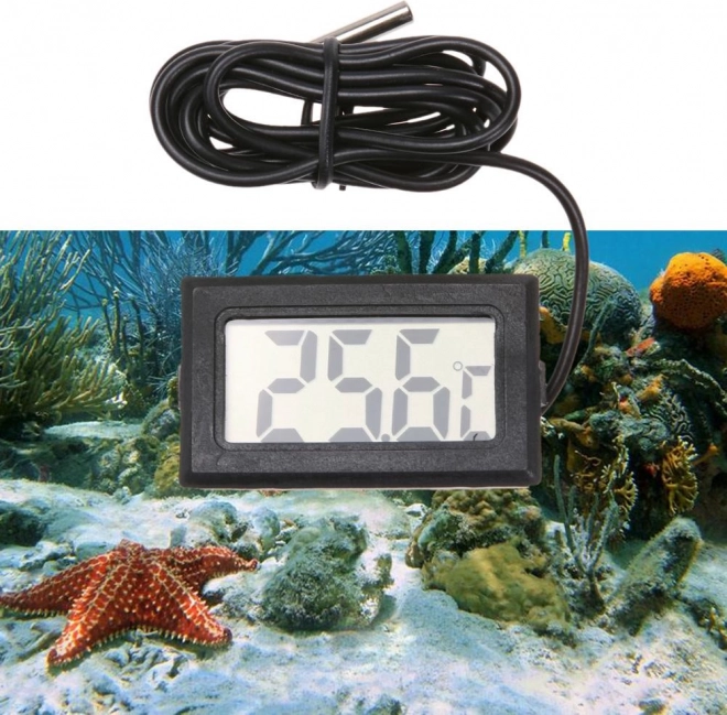 Termometru electronic cu afișaj LCD mare și sondă pe cablu lung. Sonda (senzorul) poate fi plasată practic oriunde, de exemplu în acvariu, terariu, frigider, congelator, seră etc. Oriunde aveți nevoie de măsurare precisă a temperaturii în intervalul de la -50 la 70 de grade Celsius!