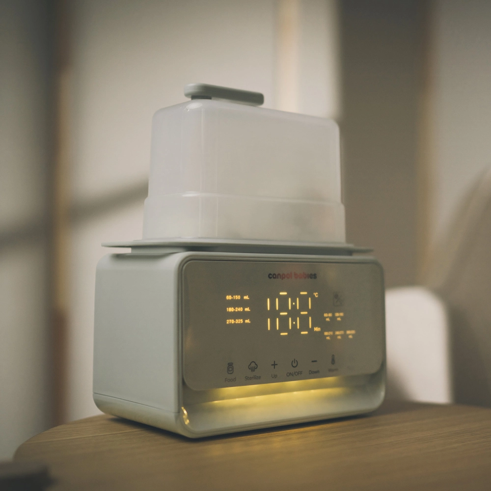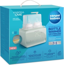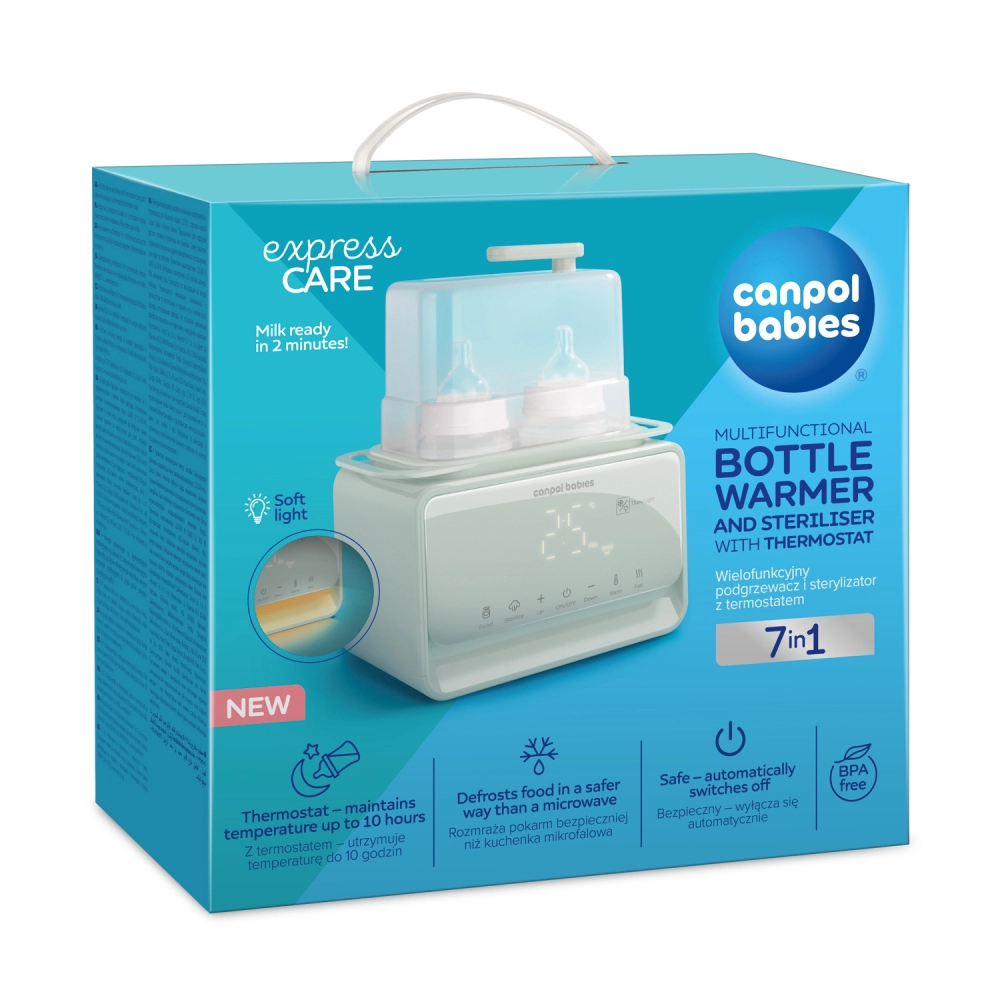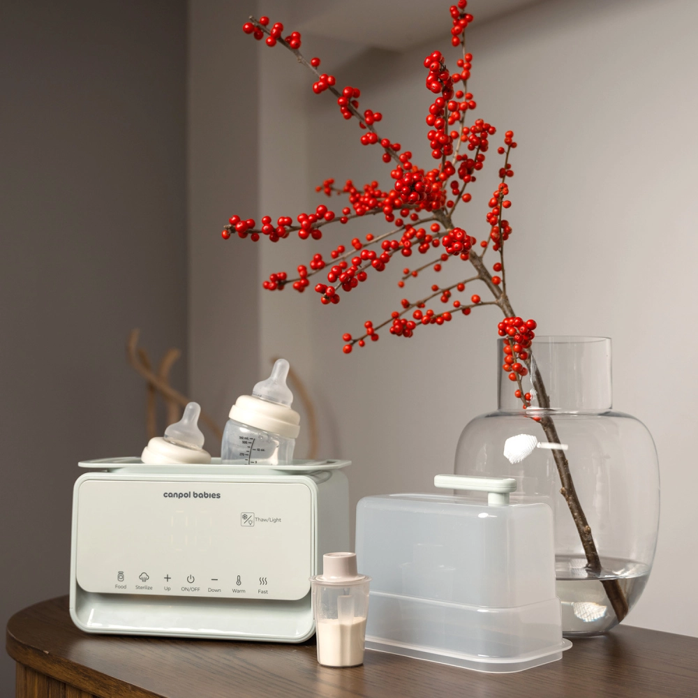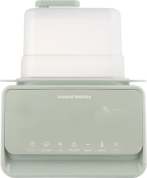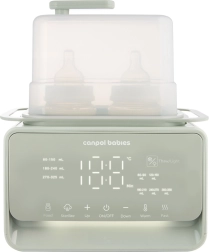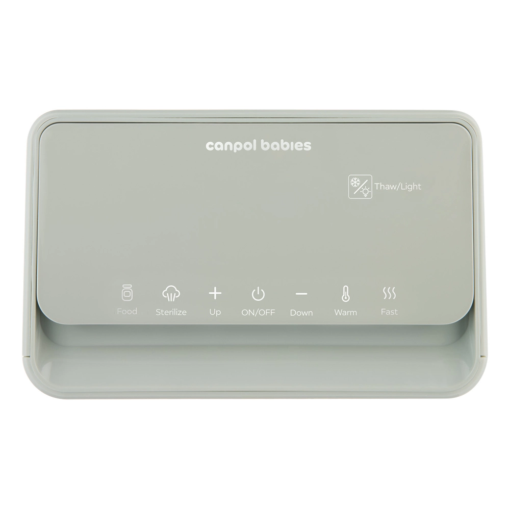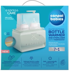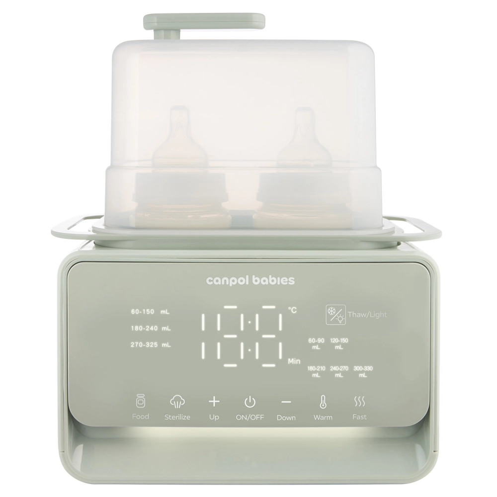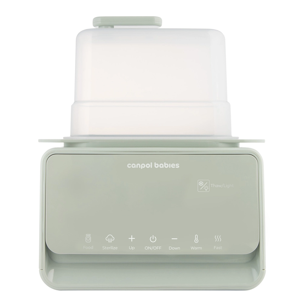 Încălzitorul și sterilizatorul electric Canpol babies 7‑în‑1 pregătește în mod fiabil laptele matern și hrana pentru bebeluși la temperatura ideală în câteva minute. Termostatul integrat menține temperatura setată până la 10 ore, chiar și la încălzirea simultană a două biberoane. În plus, dispozitivul dezinfectează biberoanele, tetinele și piesele pompei în 10 minute, astfel încât aveți totul pregătit igienic și fără griji.