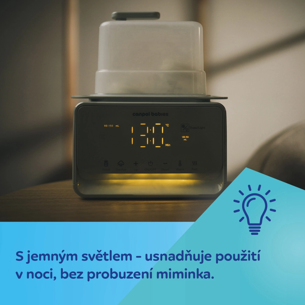 - 7 moduri: încălzire lapte, încălzire piureuri, încălzire rapidă, decongelare, sterilizare, menținere temperatură, lumină de noapte